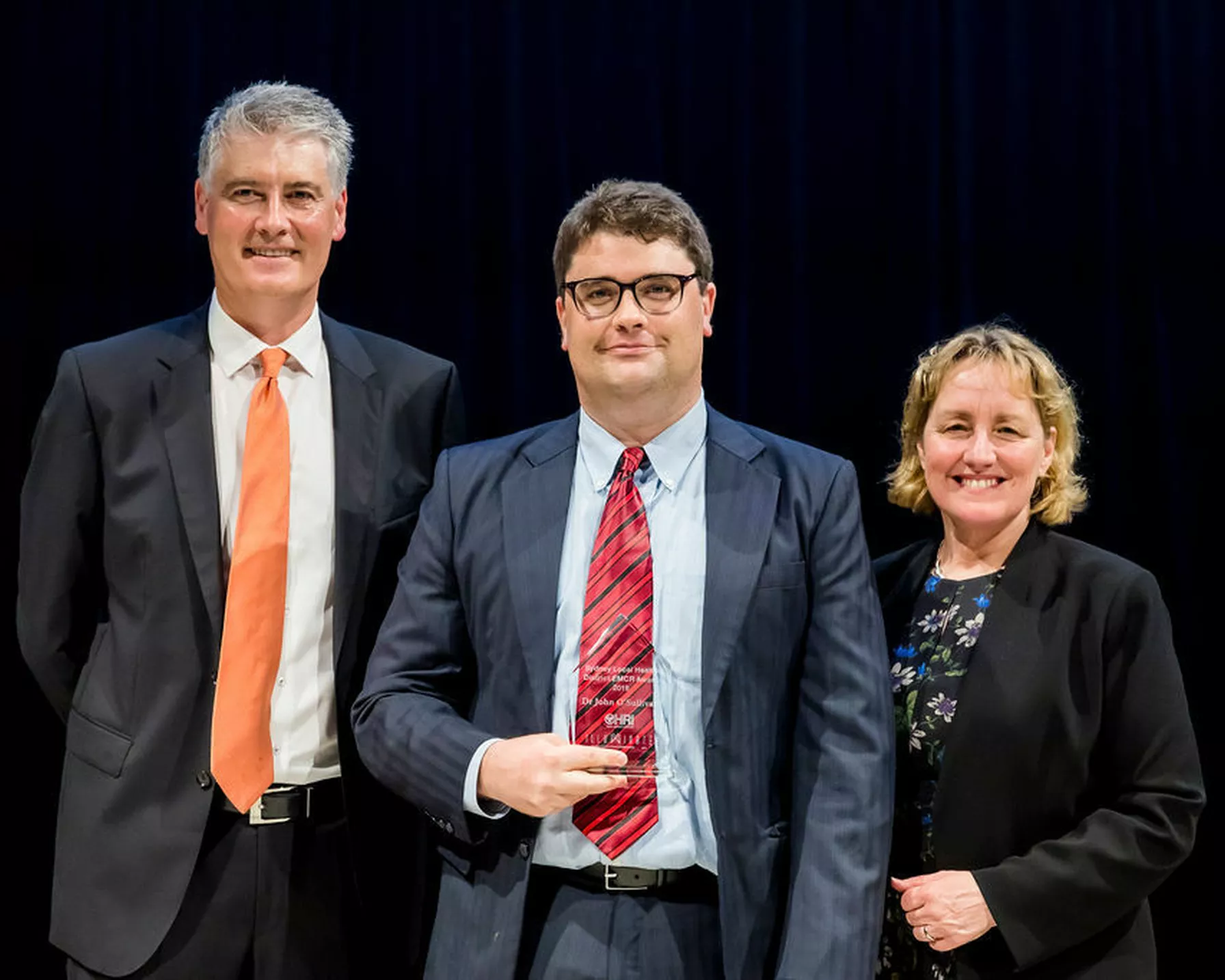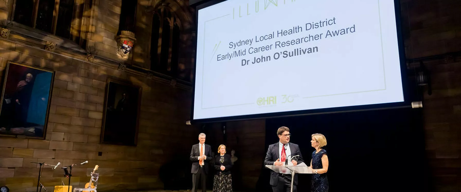 HRI Director of Cardiovascular Research Prof Shaun Jackson (left) and SLHD Chief Executive Dr Teresa Anderson AM (right) presenting the SLHD Early/Mid-Career Researcher Award to Assoc Prof John O'Sullivan (centre) at Illuminate.