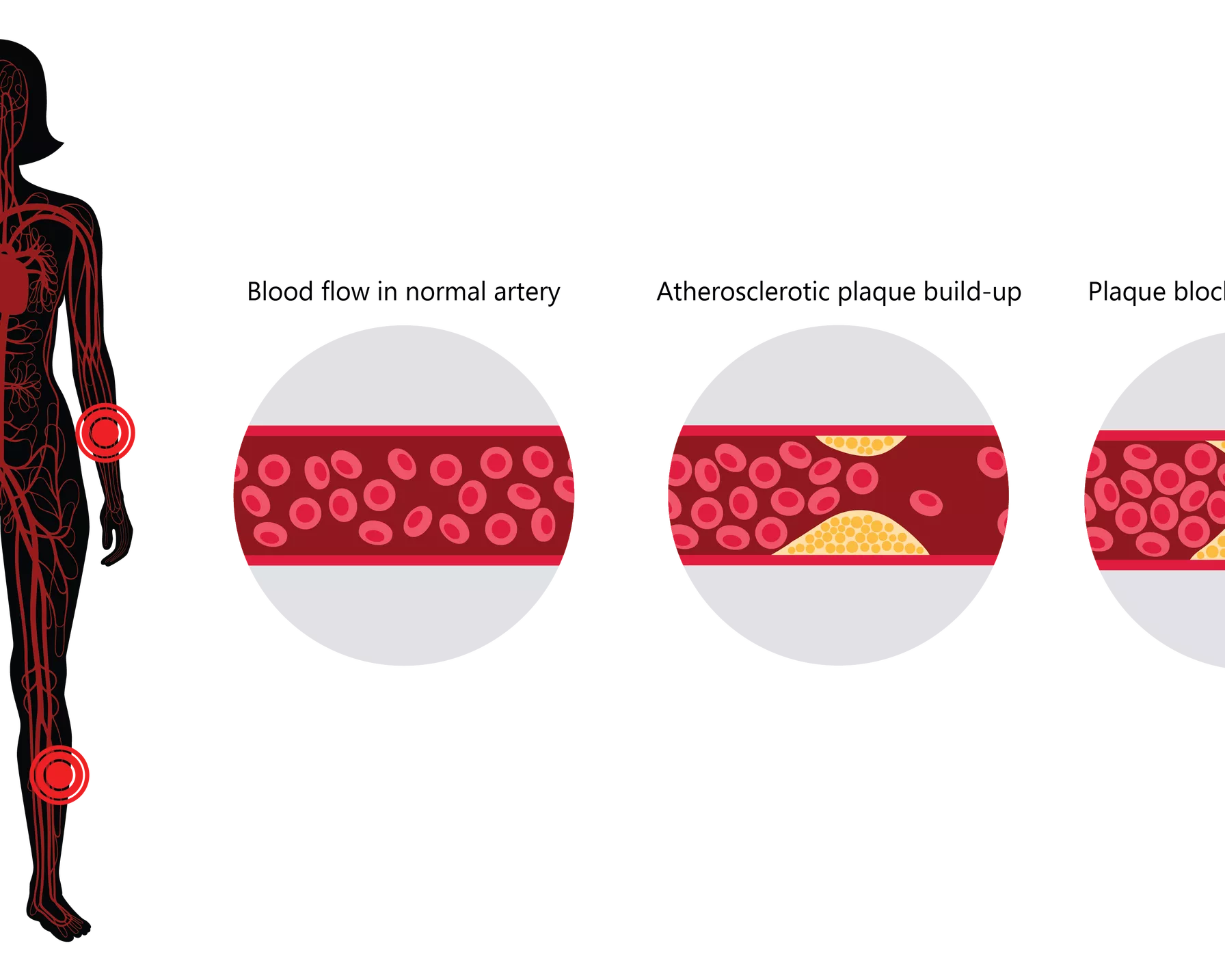 PAD is often the result of atherosclerosis. This is when plaques that are made up of fat, cholesterol, calcium and other substances build up in the walls of the arteries. Over time, these atherosclerotic plaques harden and narrow the opening of the arteries, restricting blood flow. If these plaques break open, they can form a blood clot (thrombosis) and further block blood flow.