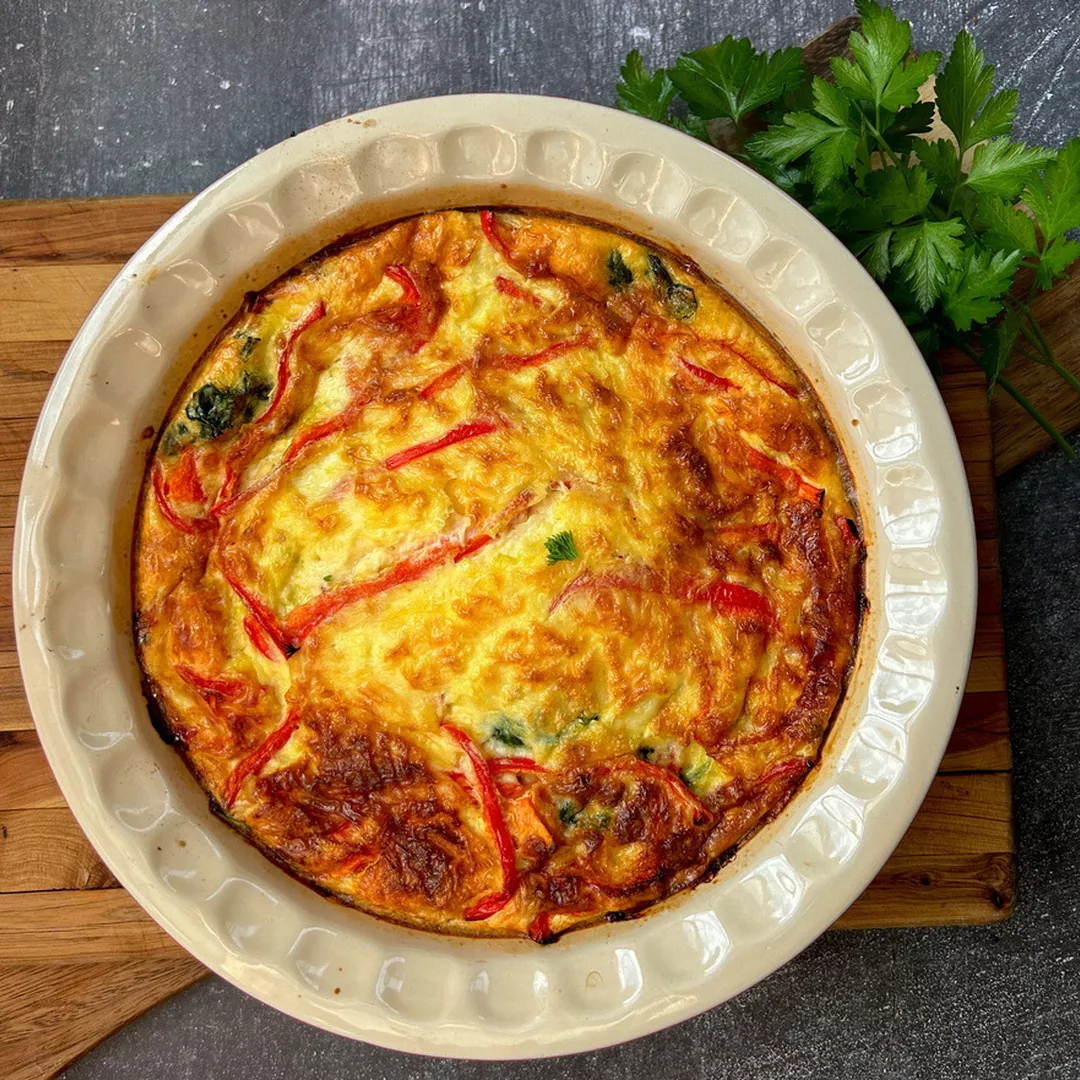 In a pie dish, place pumpkin, capsicum, cooked spinach. Pour egg mix through.