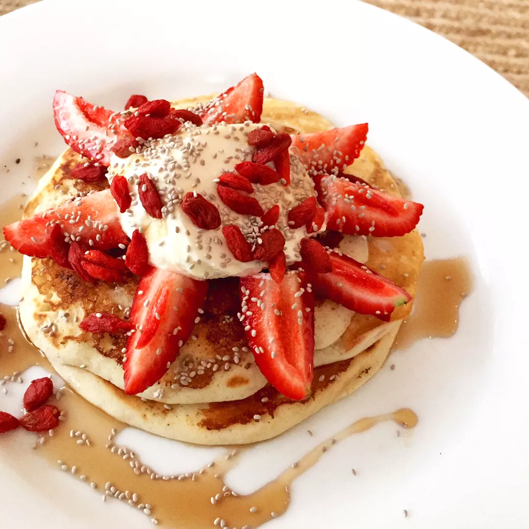 Top each pancake with a dollop or two of yoghurt, strawberries and a drizzle of honey. Serve and enjoy!