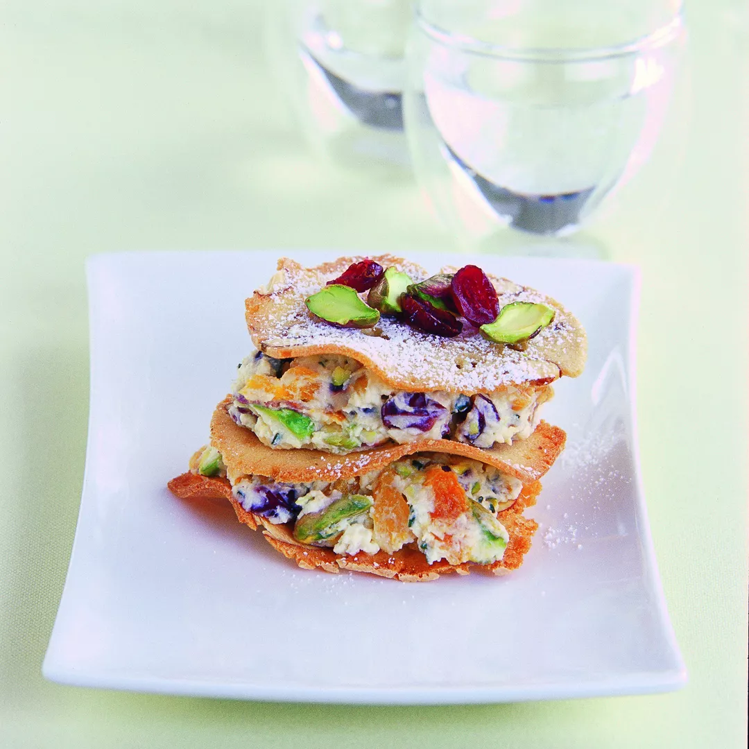 Place the remaining almond bread on top of each stack and serve sprinkled with the extra cranberries and pistachios and a sprinkling of icing sugar.