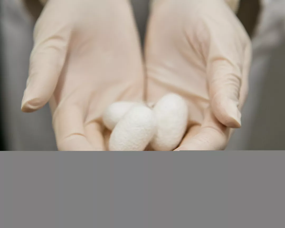 Silk cocoons that will be processed into silk fibres, and then eventually electro-spun into silk grafts.