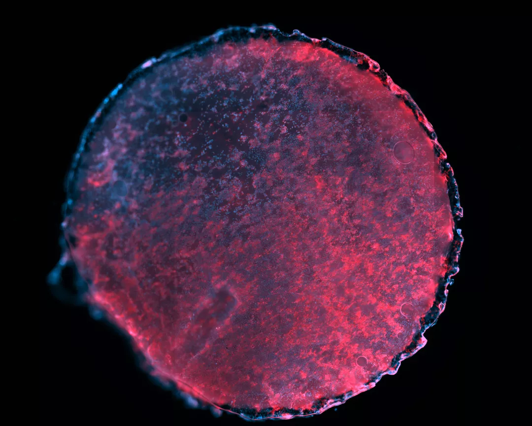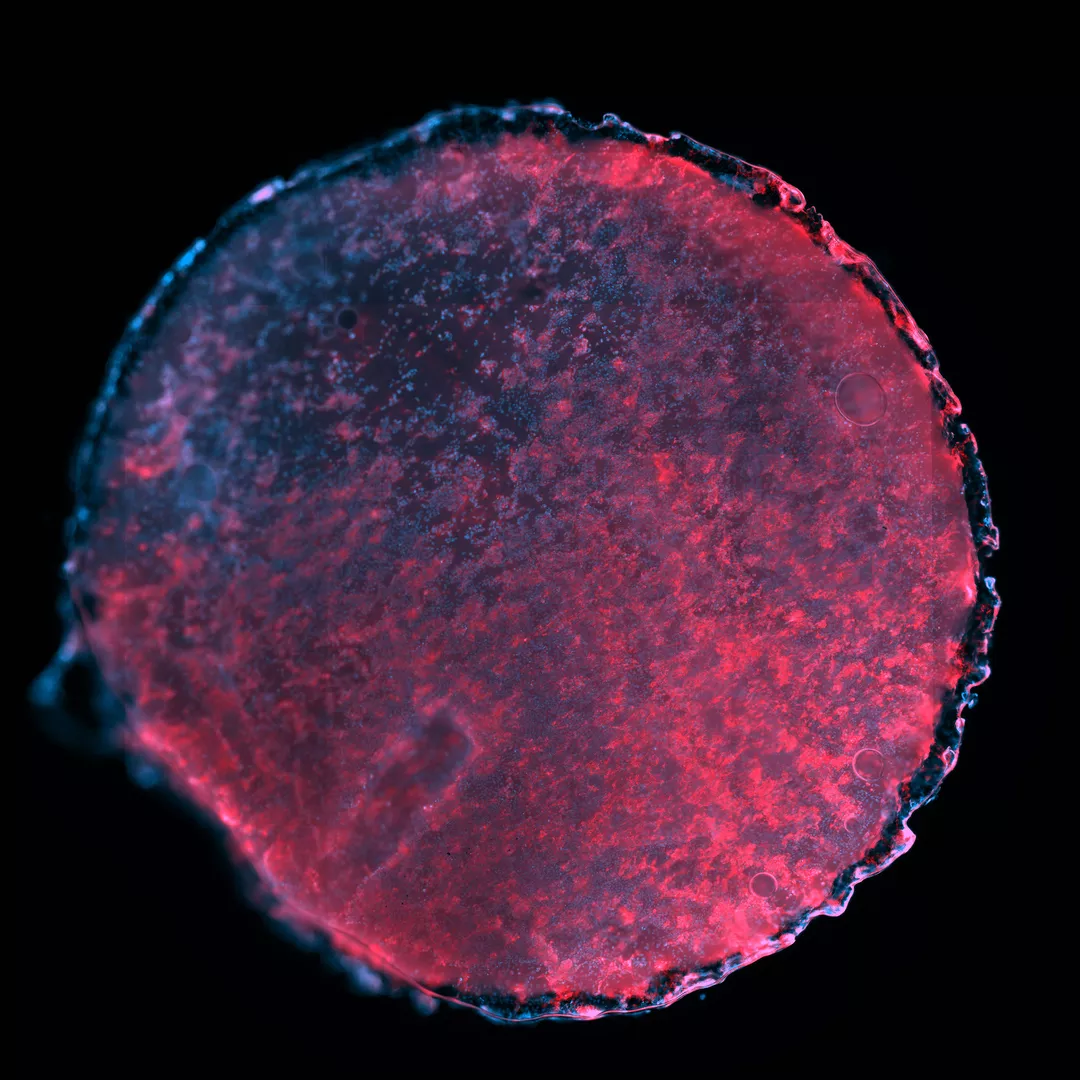 Microscope image of bio-material patch seeded with stem cells. Red stain indicates stem cell wall; blue indicates cell nucleus. Taken by Richard Tan, HRI Applied Materials Group.