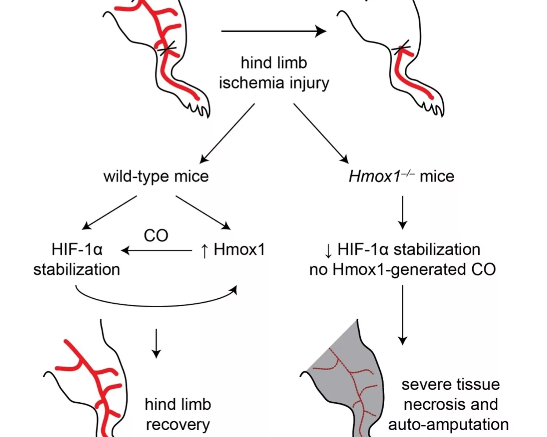 However, the study discovered that carbon monoxide derived from Hmox1 enzymatic activity can work upstream to stabilise HIF1a and amplify its adaptive response to ischaemia by favourably changing cellular metabolism to prevent ischaemia-induced amputation. These benefits were independent of any changes in growth of new blood vessels.