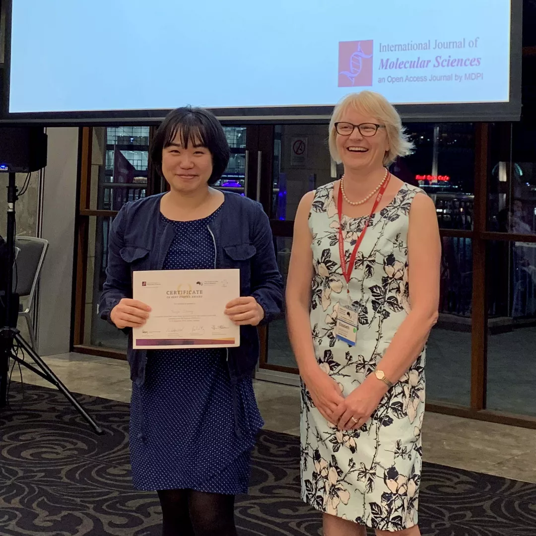 Image: Ms Yunjia (Carmen) Zhang receiving the Best Poster Award from Associate Professor Liz Ledgerwood, President of SFRR.